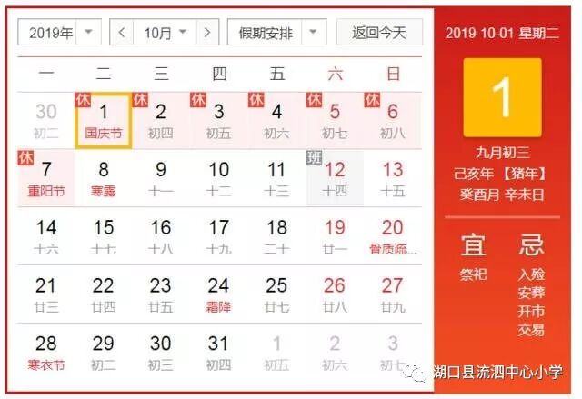 2019年10月1日至2019年10月7日放假,共7天。2019年10月8日返校上课。